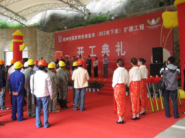 井巷公司承接的杭州市国家粮食储备库(803地下库)扩建工程开工典礼于2010年10月18日10点18分在杭州市粮食收储公司南星桥分公司举行。公司副总经理羊再兴、质安部部长余仲生及全体项目部职工参加了开工典礼。