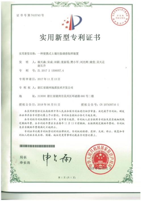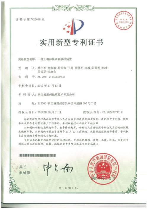 近日,核工业井巷建设集团浙江省湖州地质技术开发公司再获“一种便携式土壤污染调查取样装置”“一种土壤污染调查取样装置”两项实用新型专利,为“德清县农用地土壤污染状况详查样品采集项目”的开展和公司高新技术企业的申报起到促进作用。